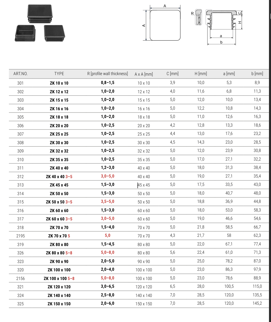 For example: external diameter (outside size) of tube(A) 25x25mm then size of plugs=25x25mm